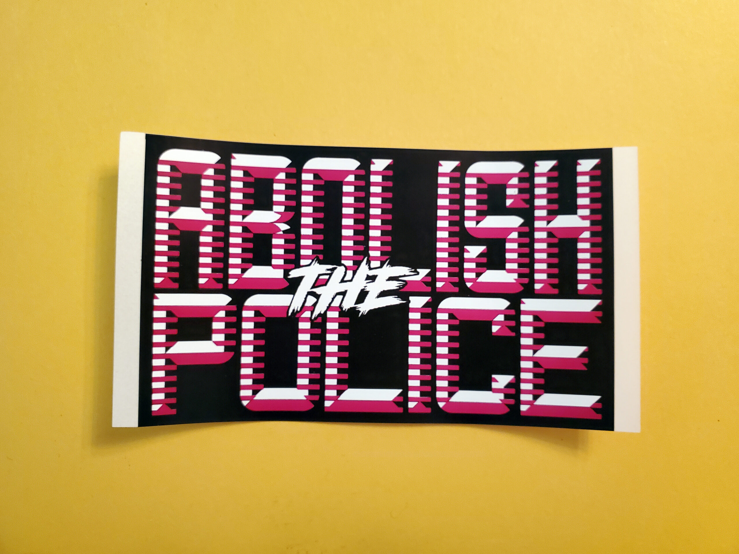 4″x2.4″ rectangular sticker with black and purple ink screen-printed on white eggshell vinyl.