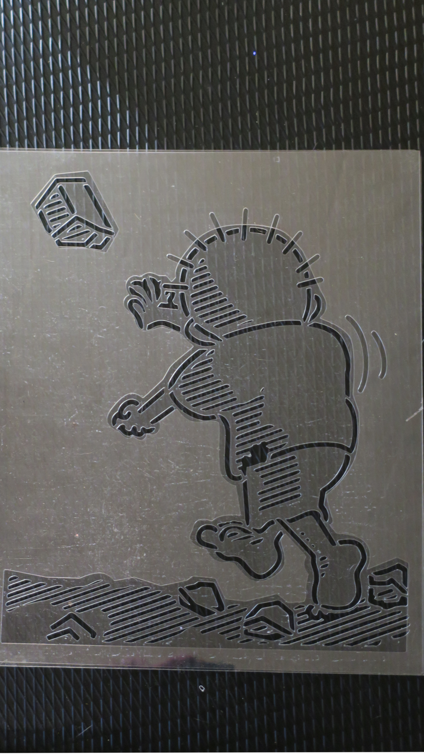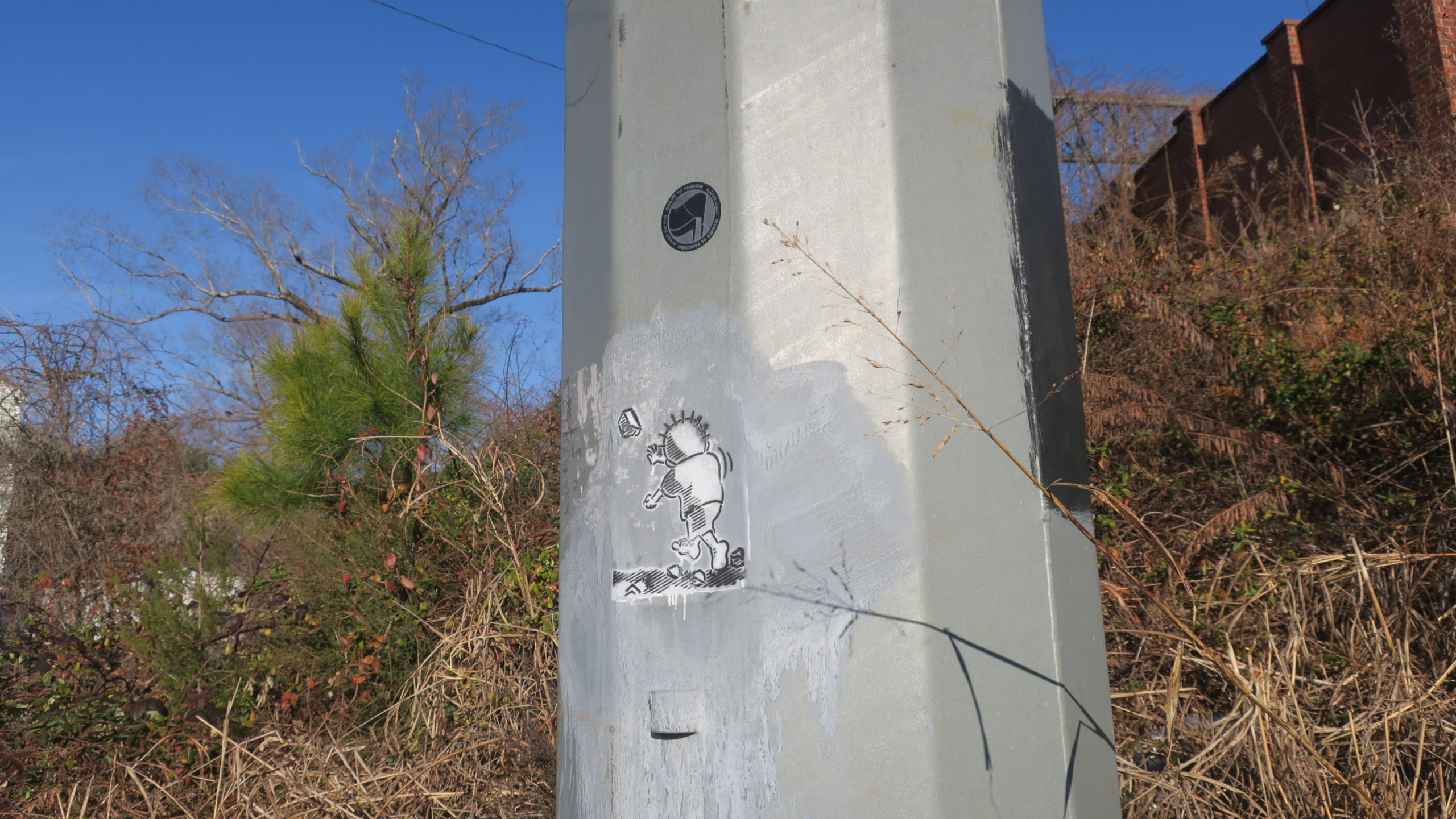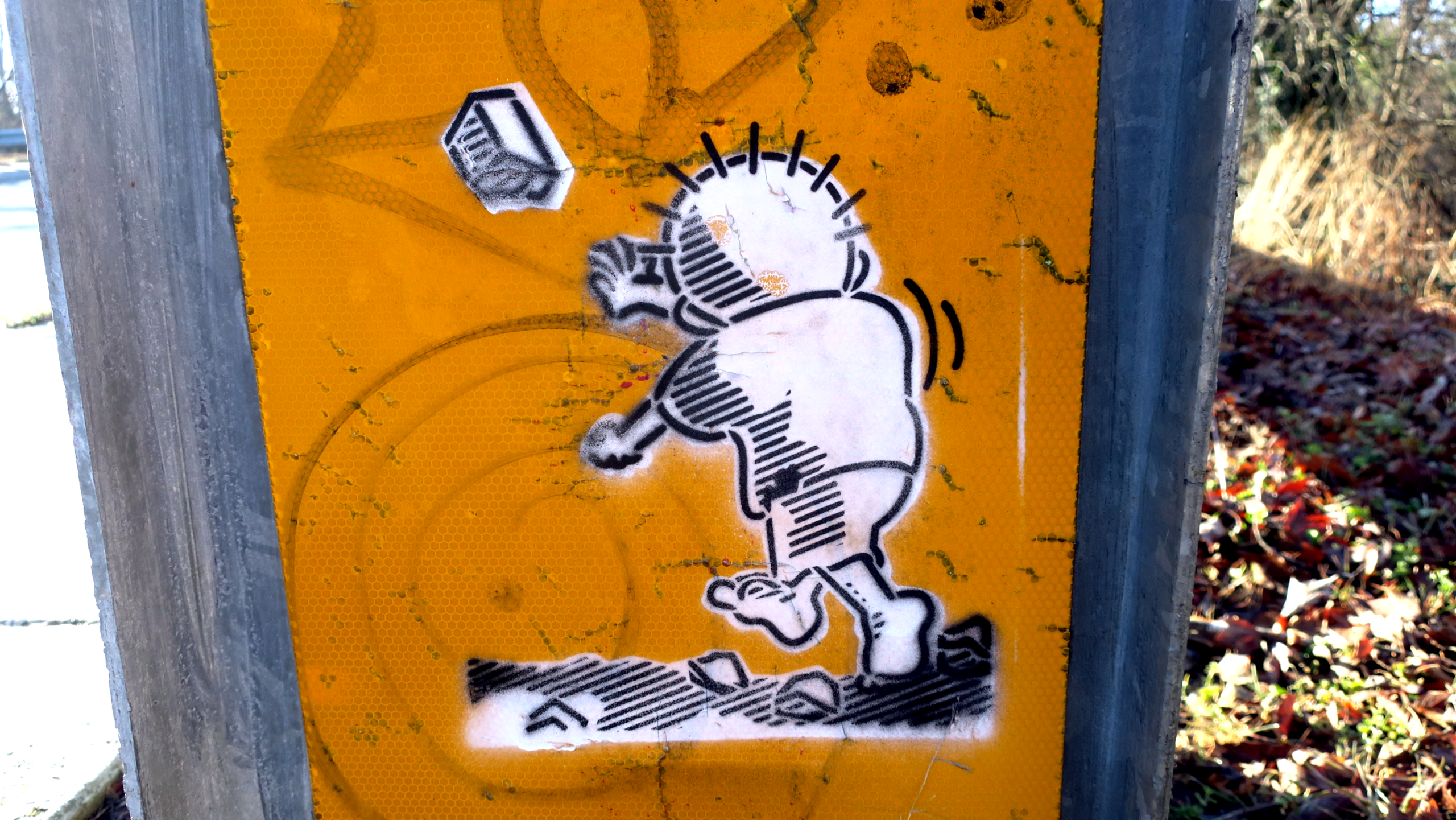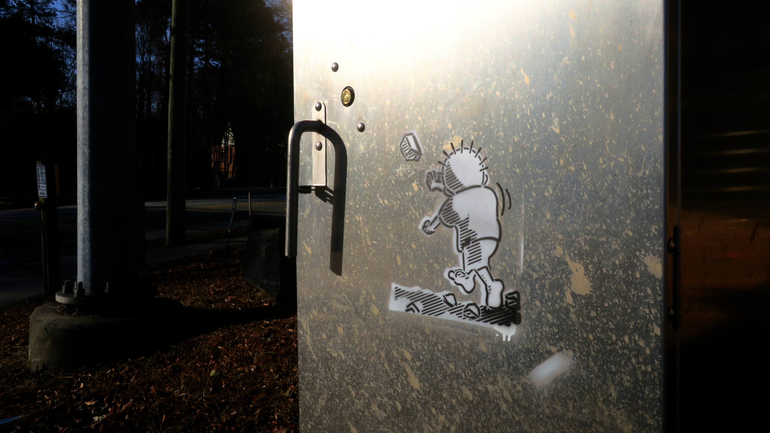 The latest in Municipal Adhesives vandal supply technology: STENCILS! Like stickers, but for the braver among us. They don’t peel off, and you can reuse them indefinitely! You supply the spray paint and the courage. Use the cardstock included with the stencil to further mask and prevent stencil overspray (a lesson learned after the picture of the stencil in use).