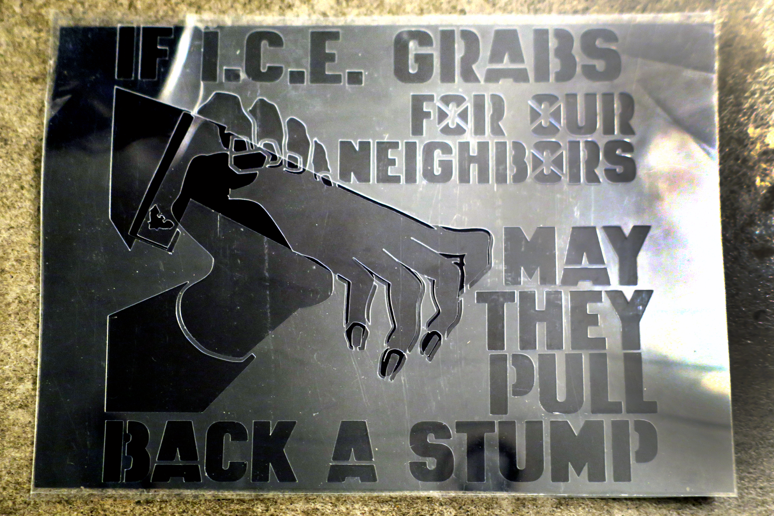 The latest in Municipal Adhesives vandal supply technology: STENCILS! Like stickers, but for the braver among us. They don’t peel off, and you can reuse them indefinitely! You supply the spray paint and the courage. Use the cardstock included with the stencil to further mask and prevent stencil overspray.
