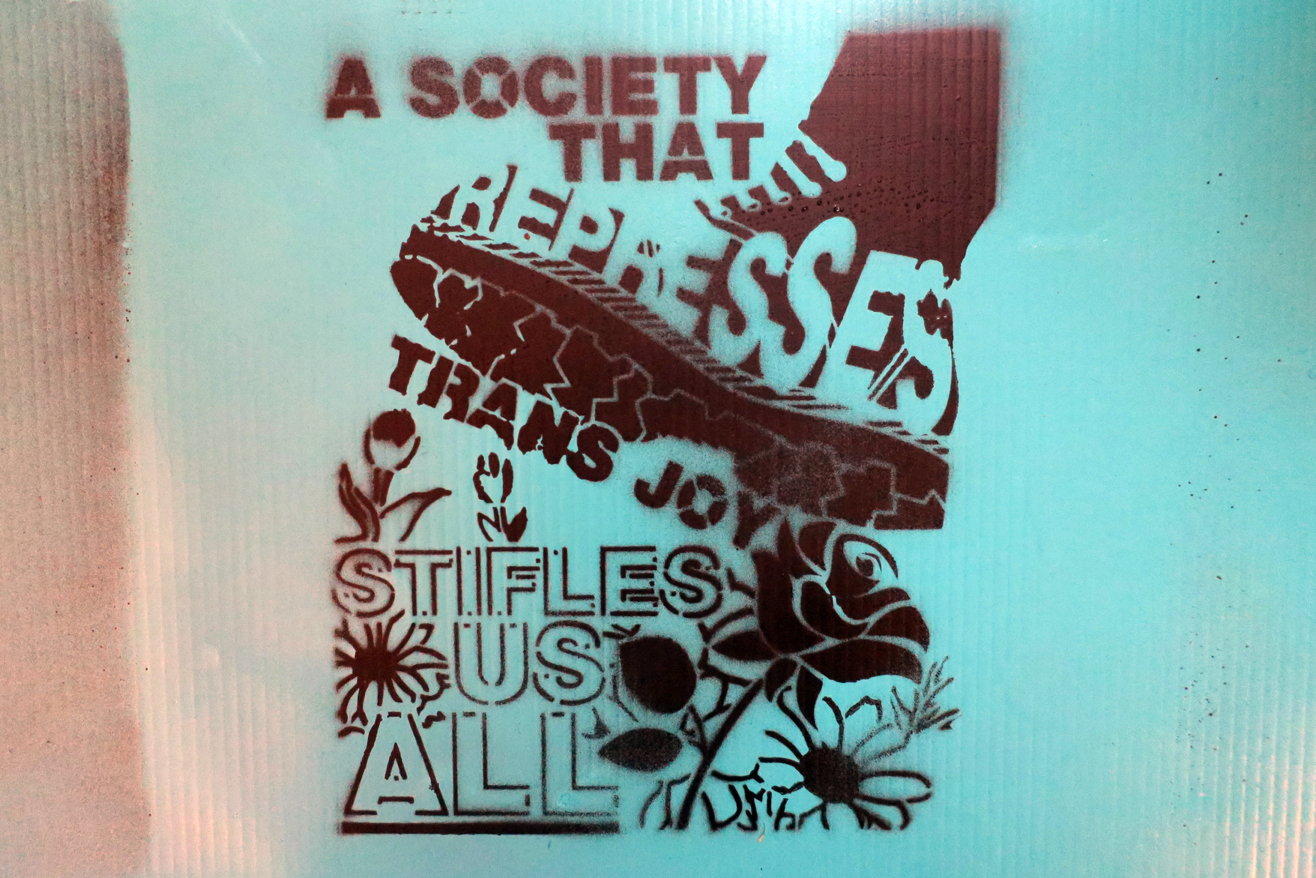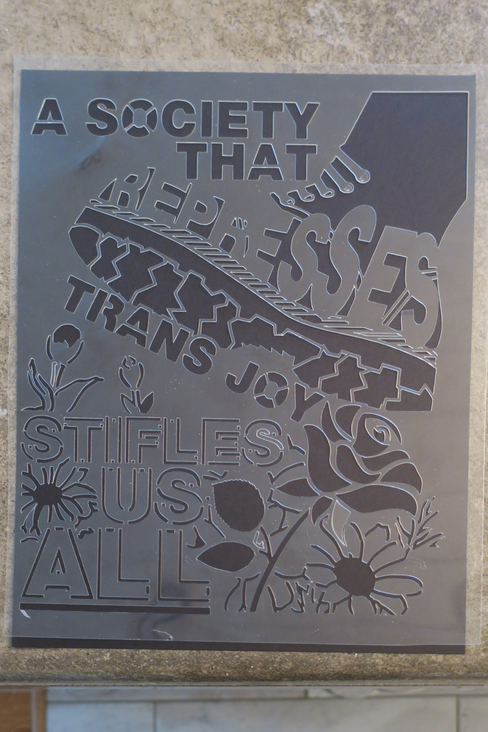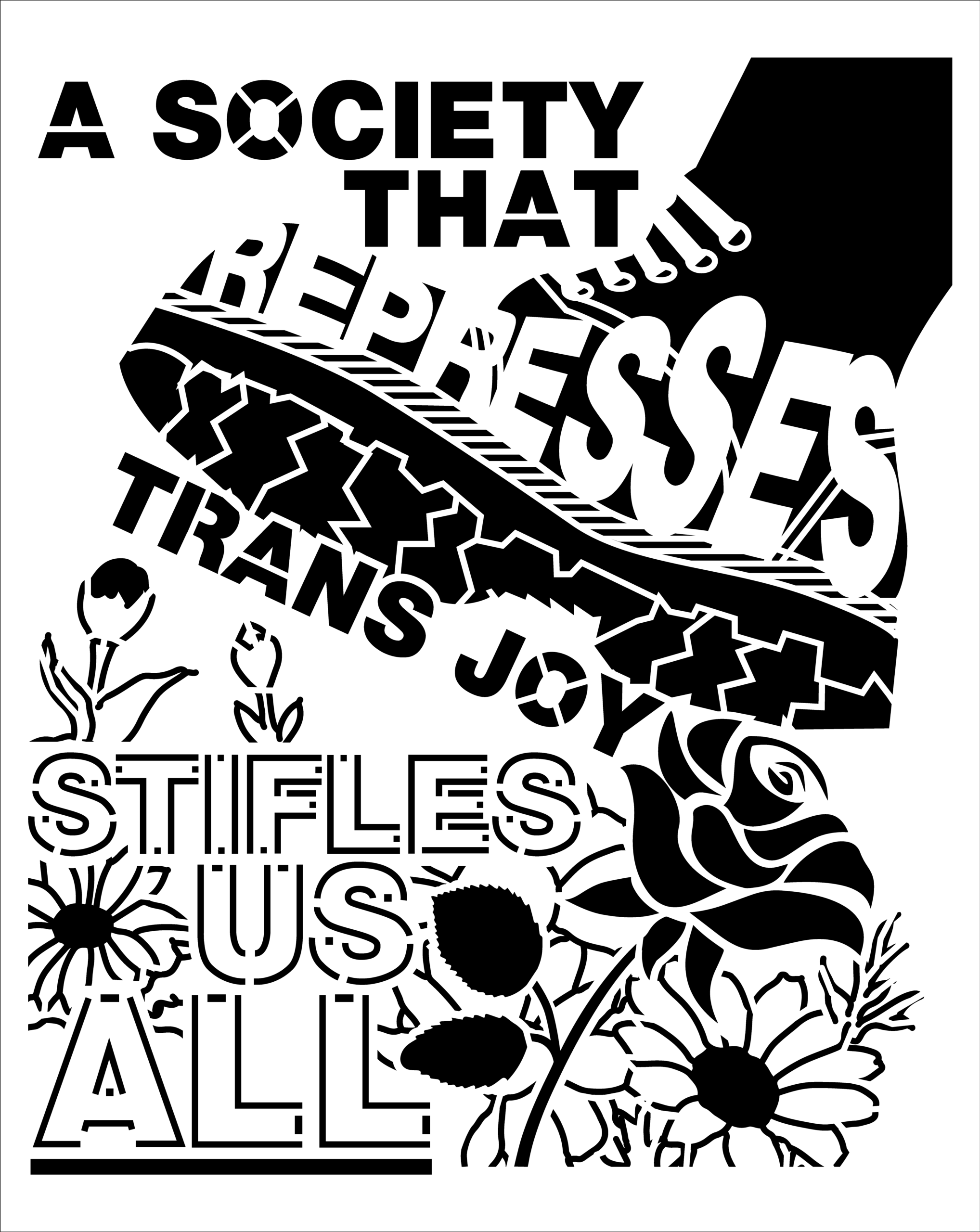A simplified version of our popular “Trans people’s joy enriches everyone[…]” sticker 11″x8.75″ cut from 7mil transparent white mylar. Designed for dark color on light color but hey: you do what you want with it.