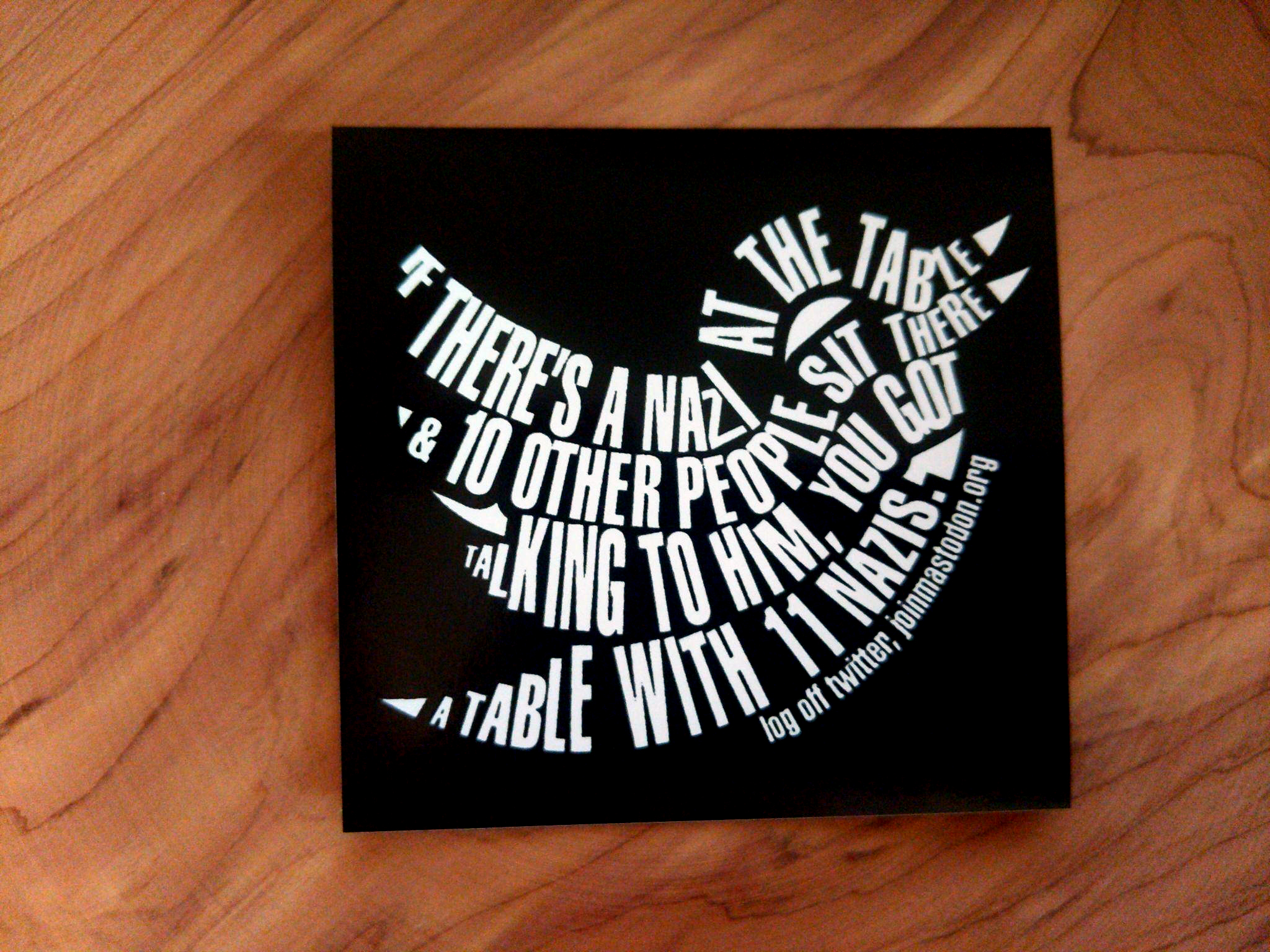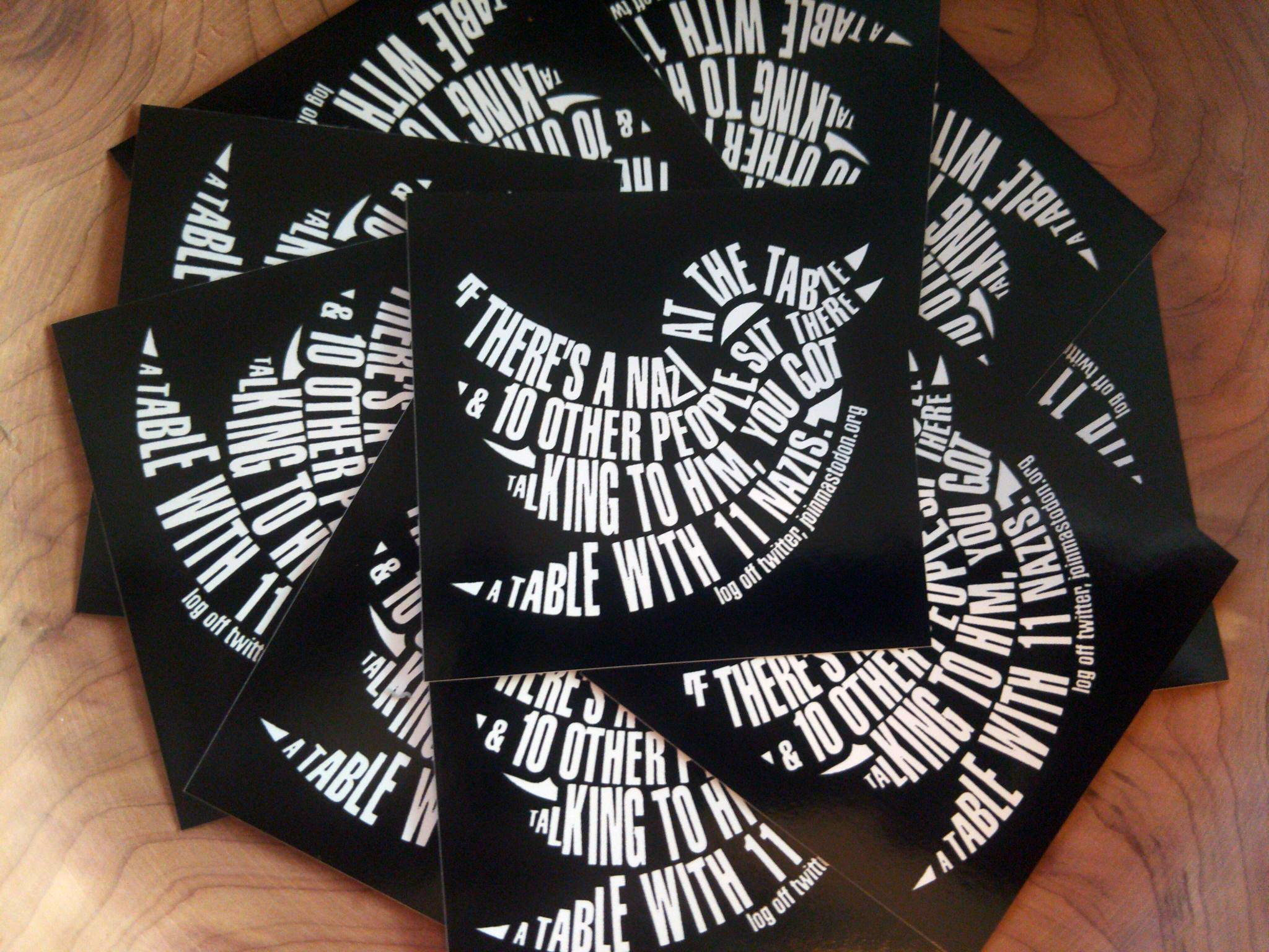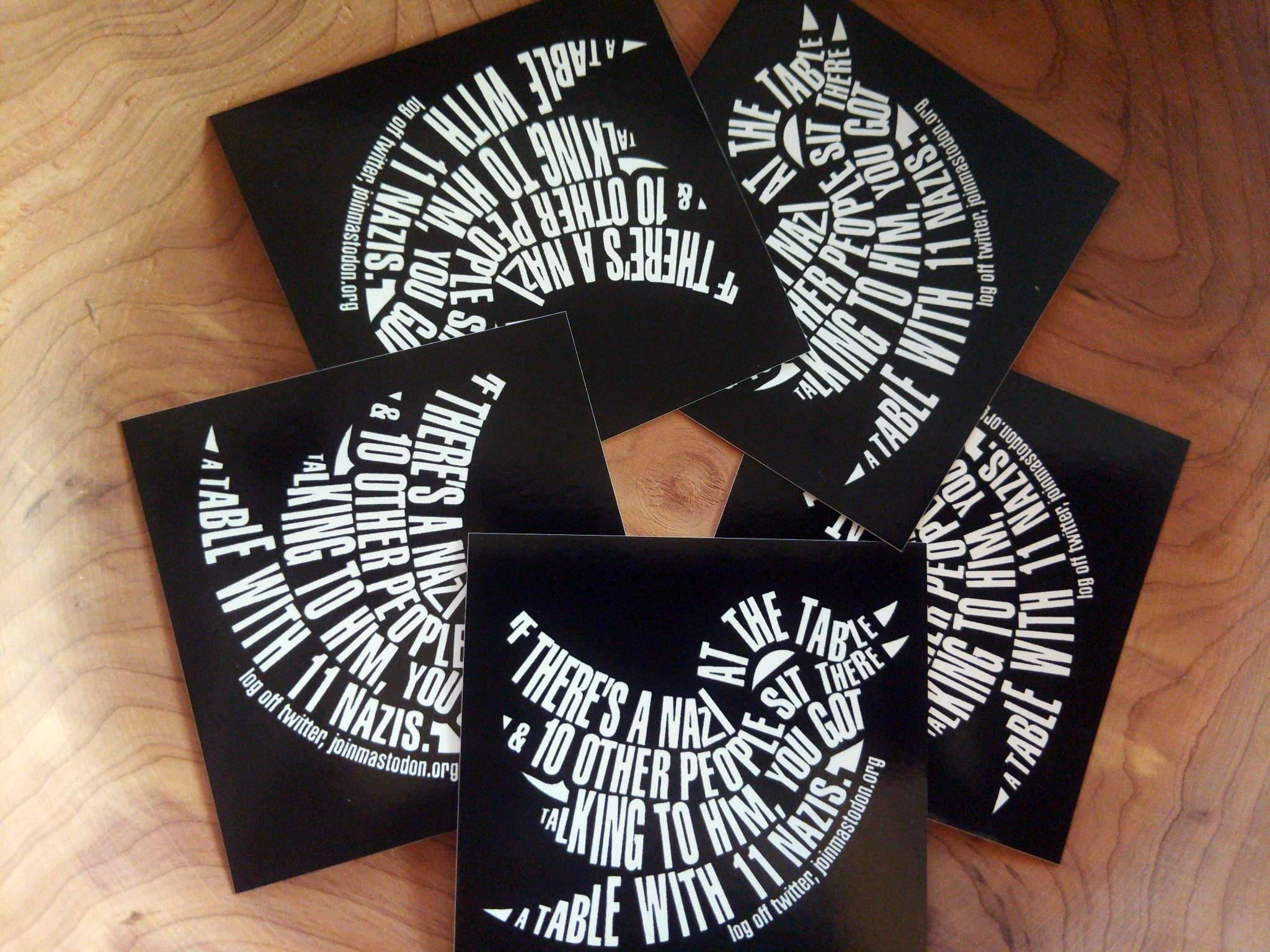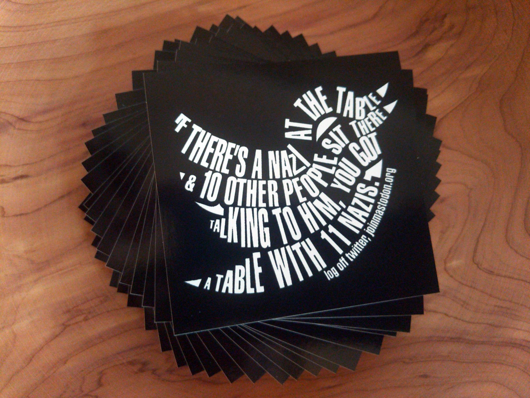 Fediverse recruitment 2.75″ square stickers with black ink screen-printed on white vinyl.