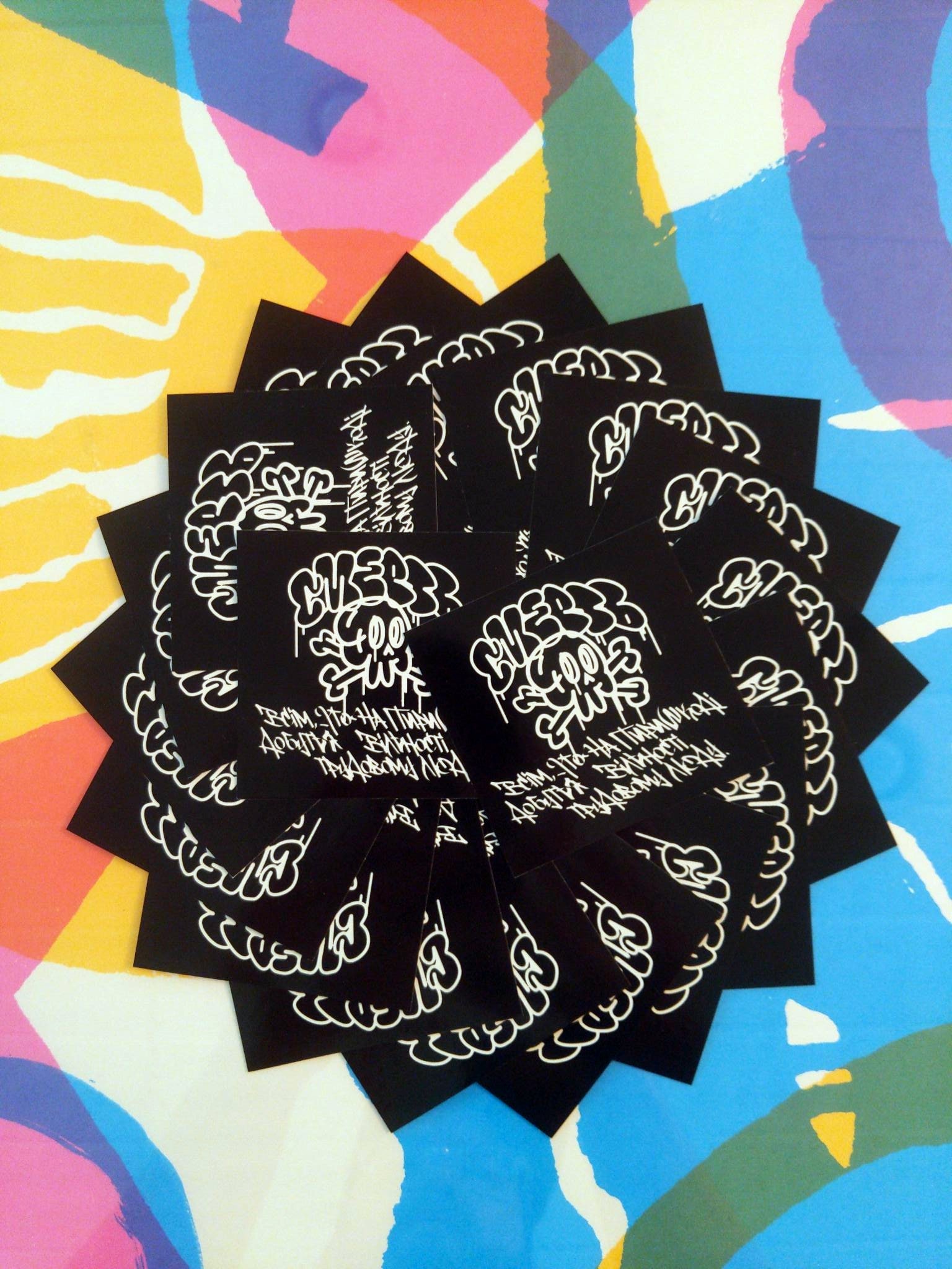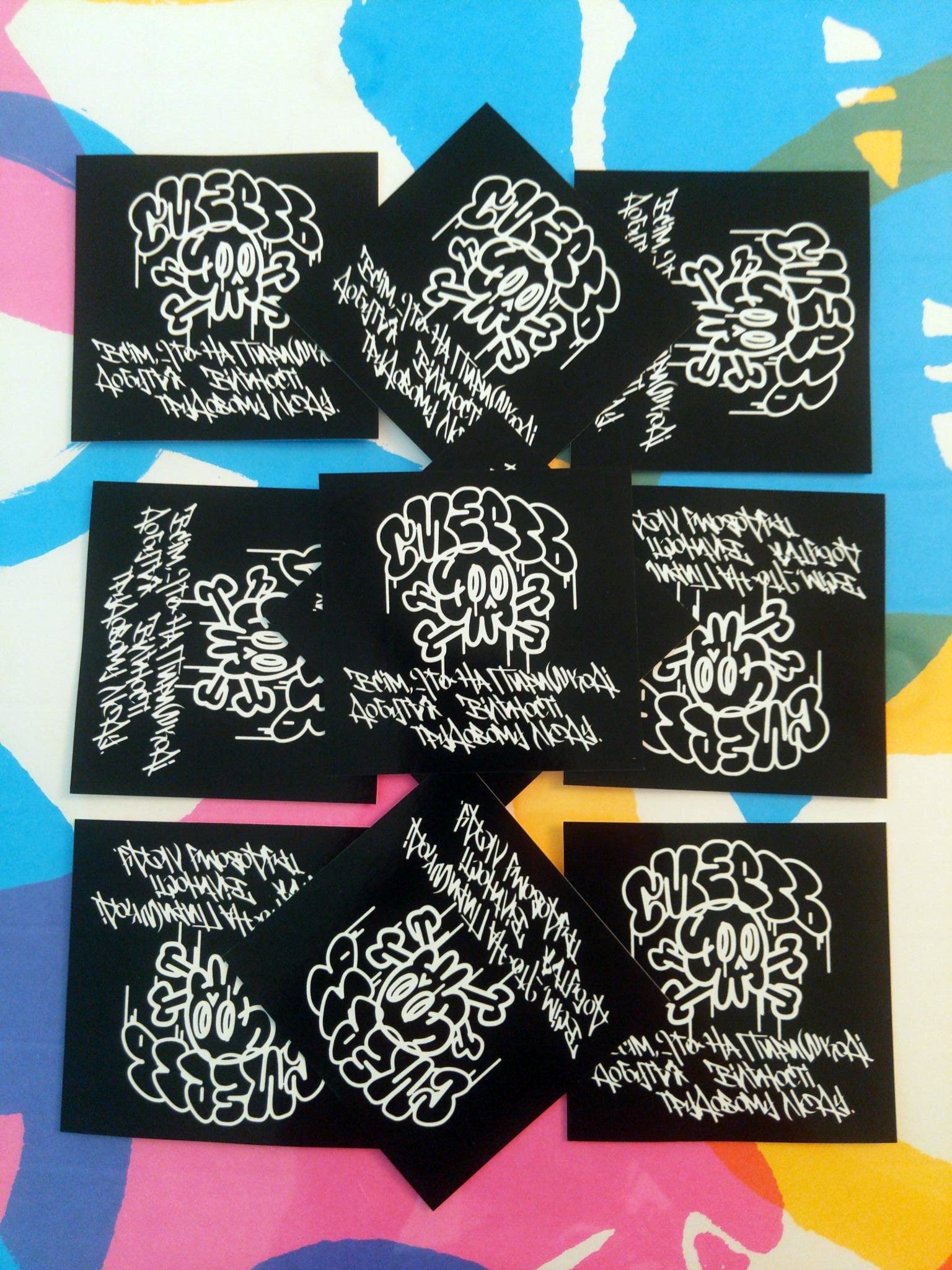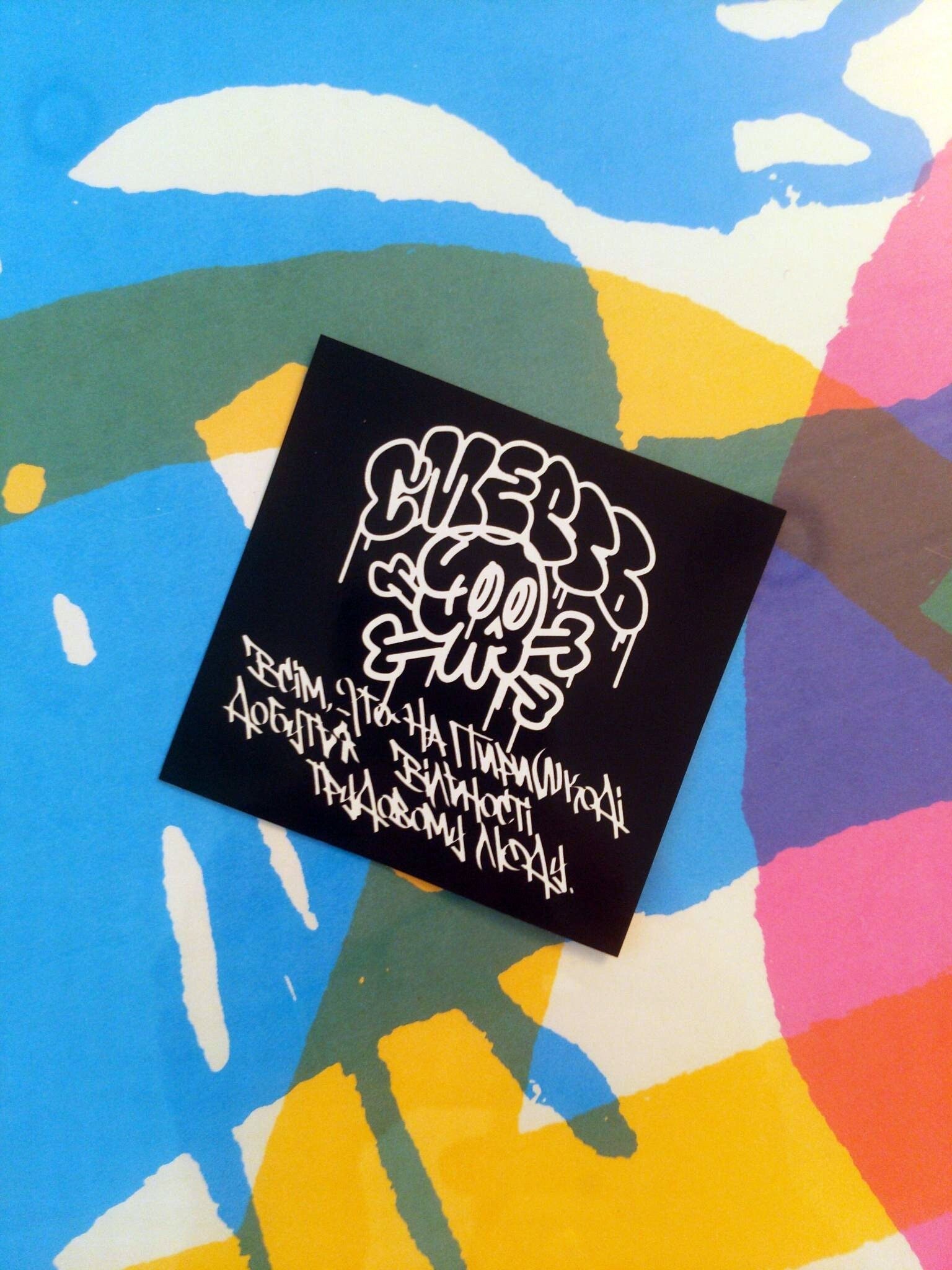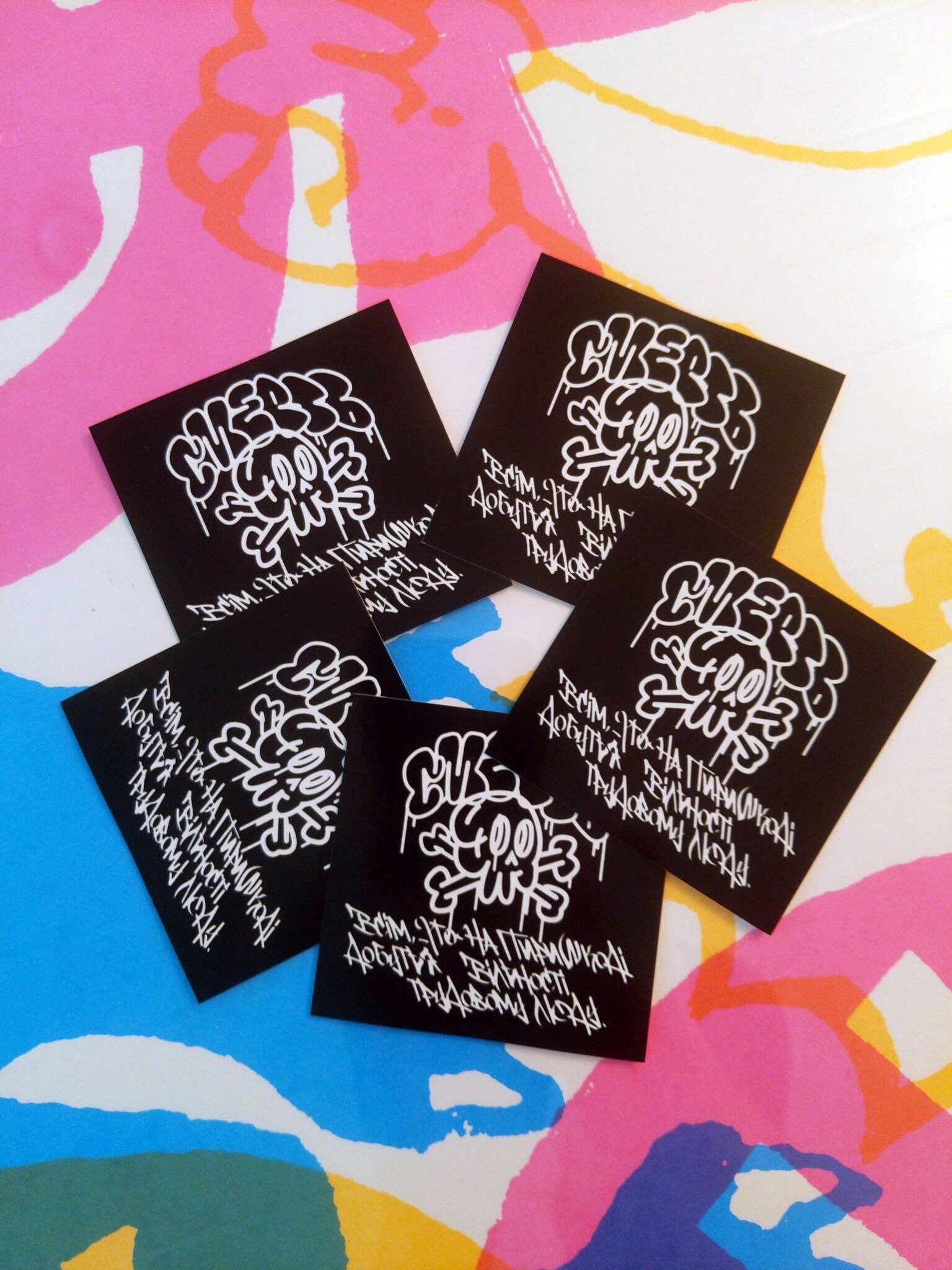 2.75″x2.75″ sticker with black ink screen-printed on white vinyl.