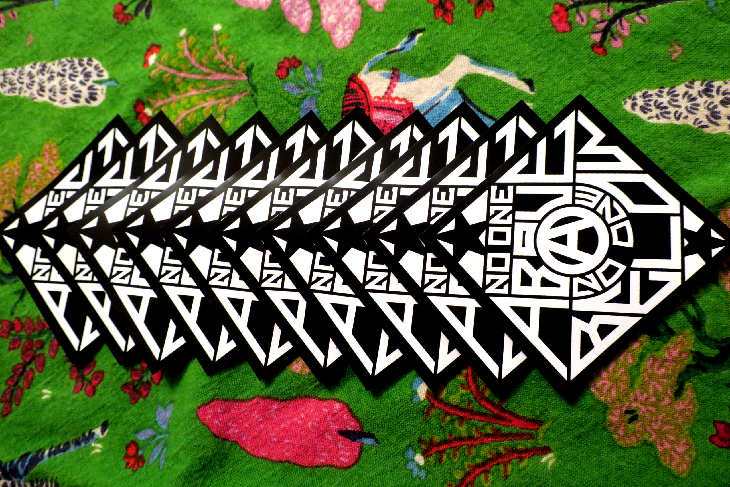 2.75″x2.75″ diamond shaped sticker with black ink screen-printed on white vinyl. Original design by Municipal Adhesives.