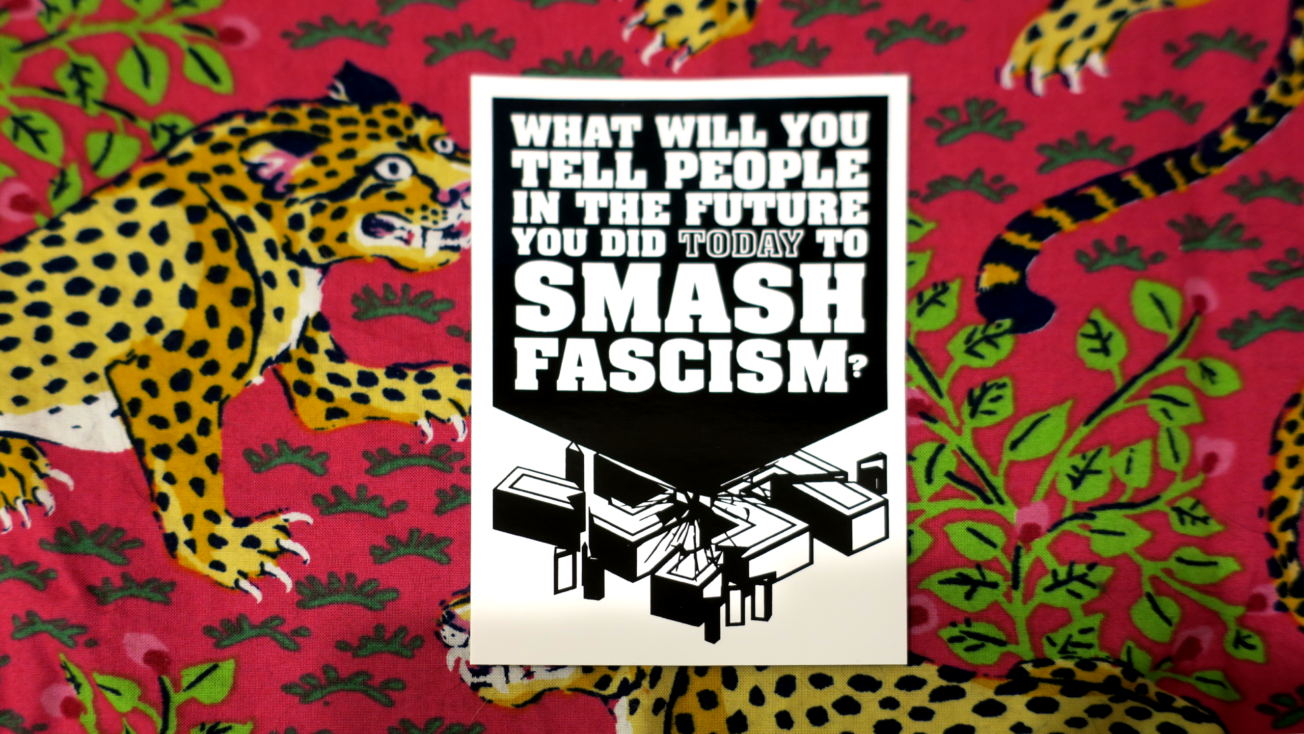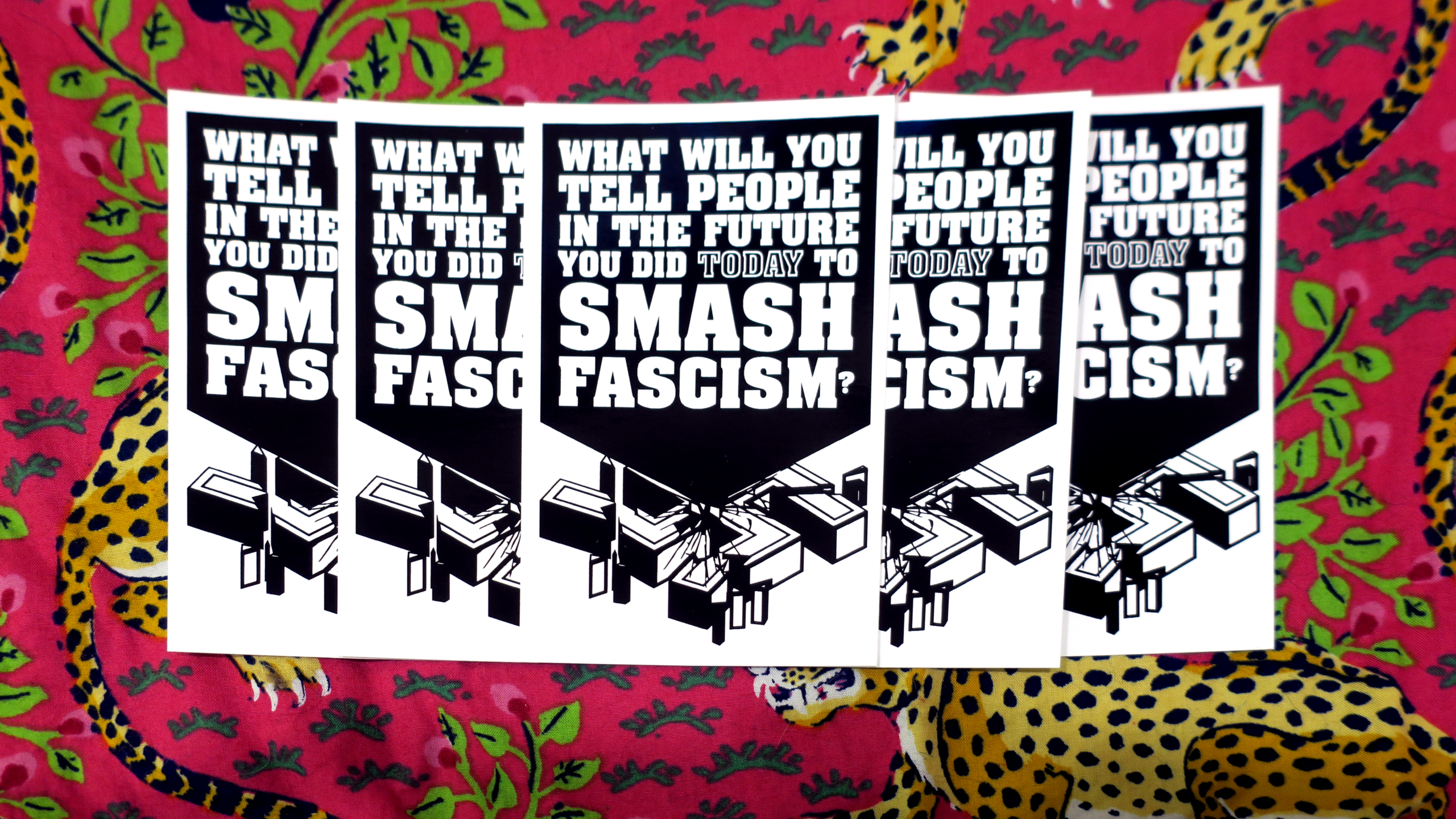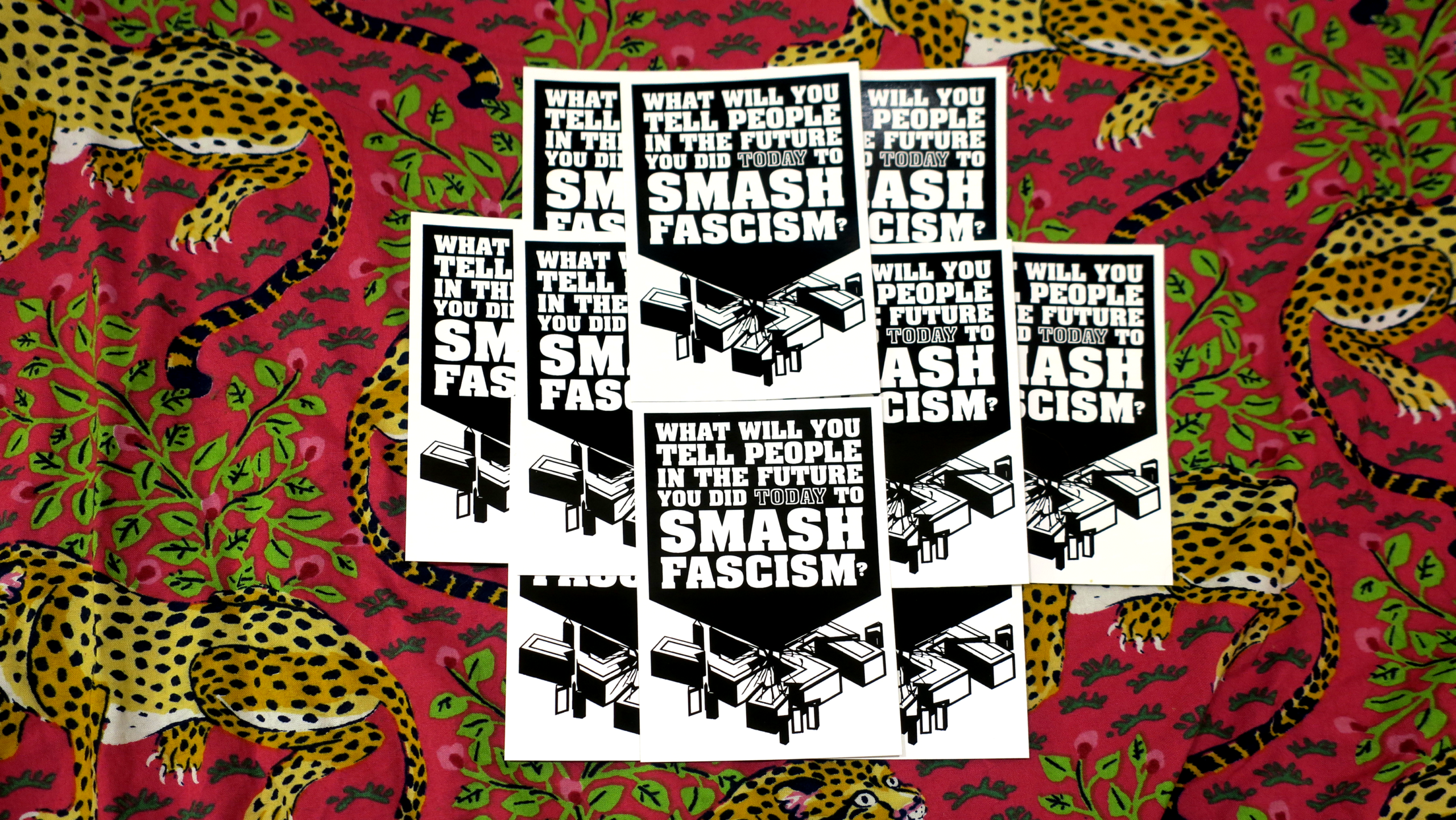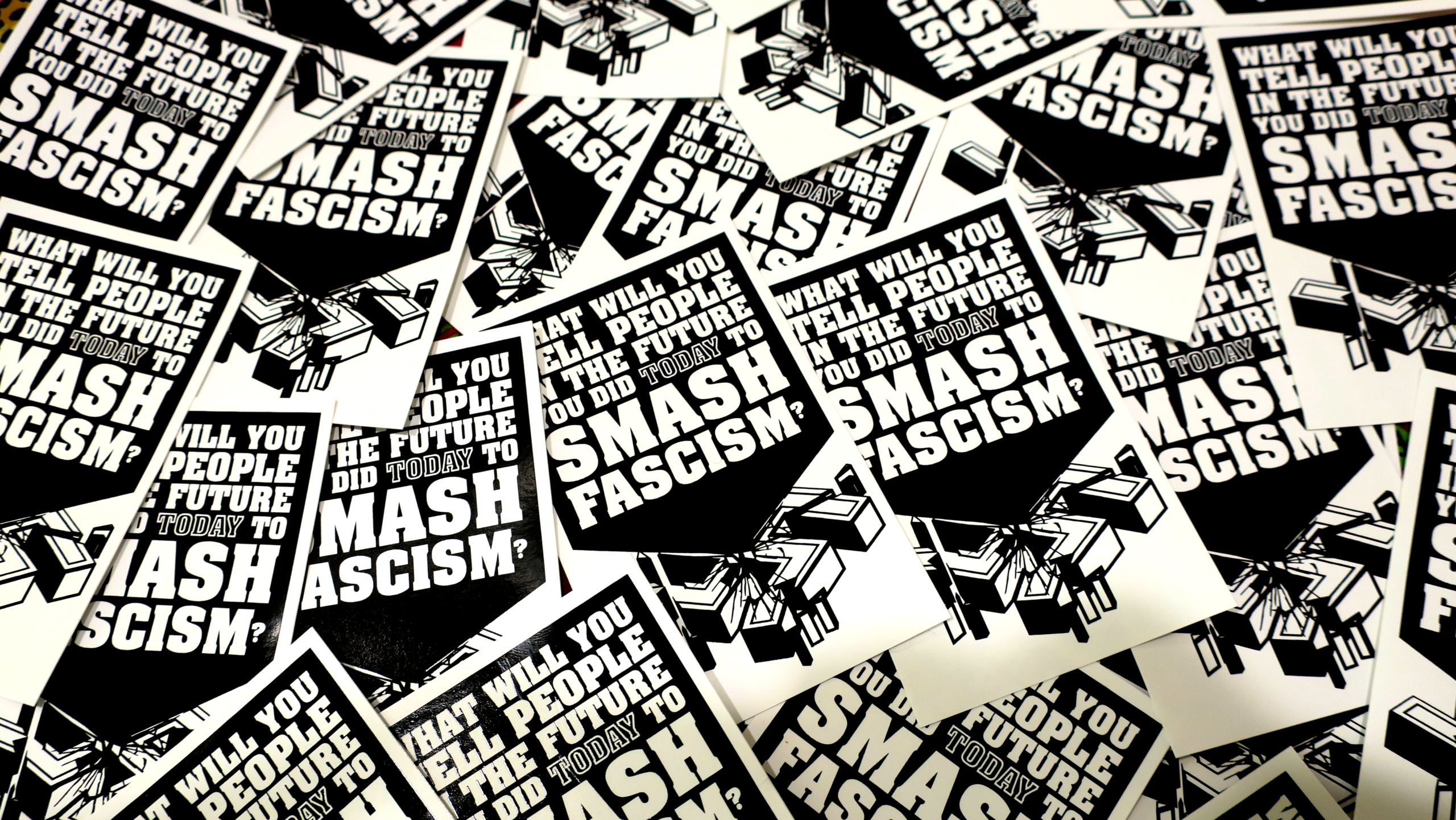 These high-quality stickers are priced to sell in quantity, so that you can decorate your block, protect an area from fascist recruiting, and give them to sympathetic friends and family.