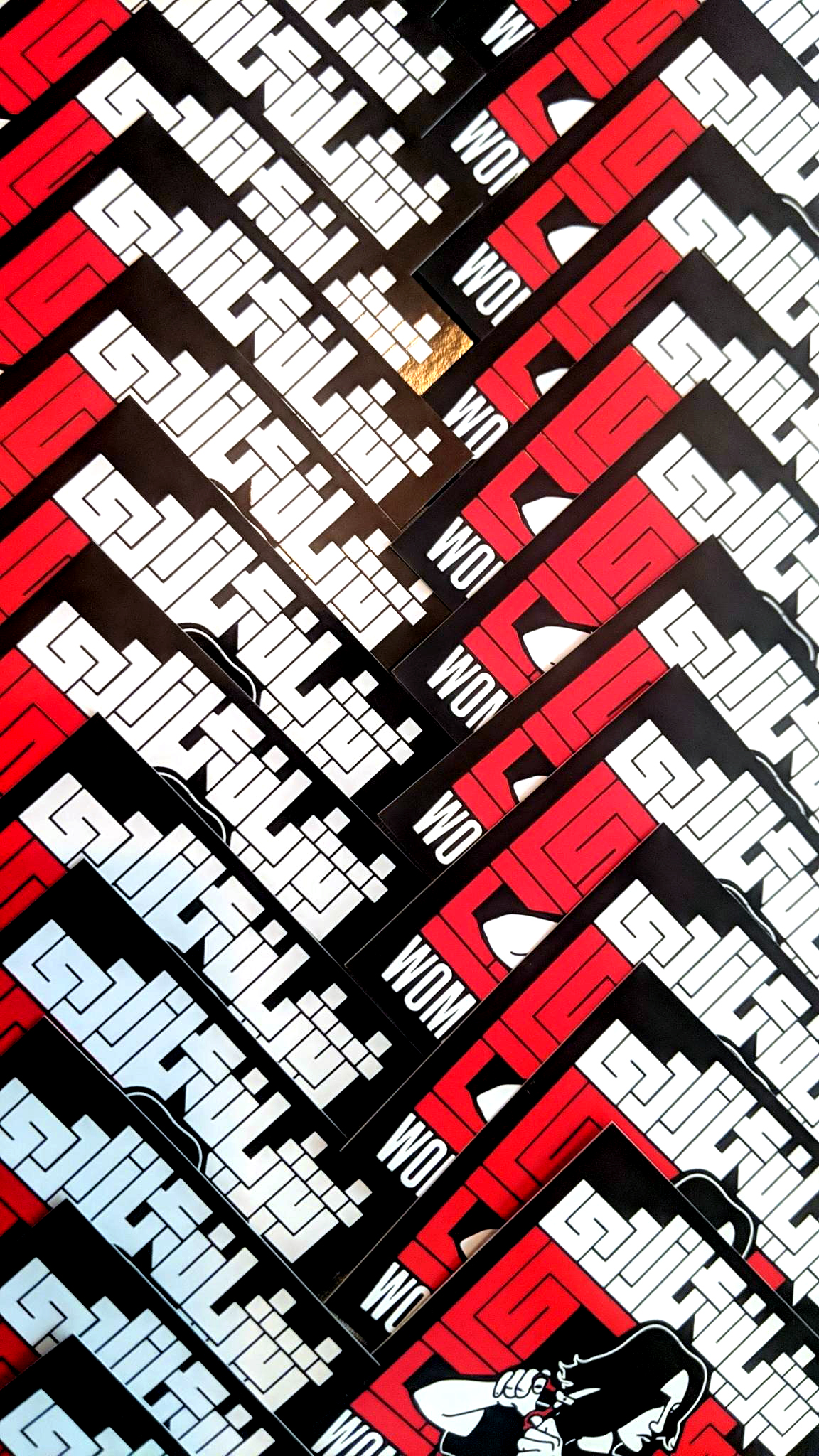 2.75″ square sticker with red and black ink screen-printed on white chrome vinyl.
